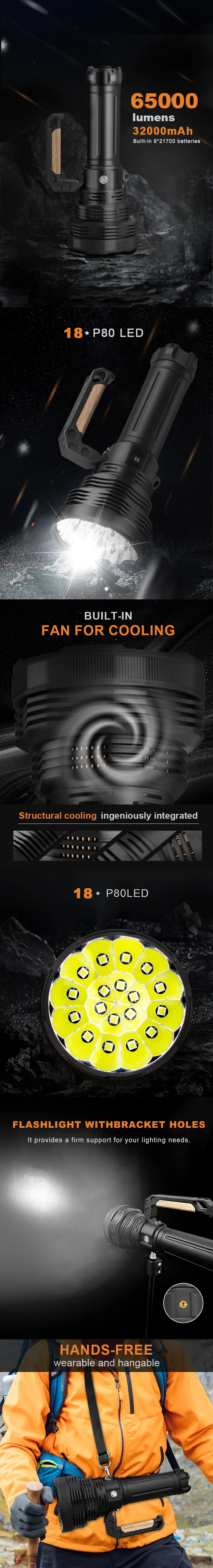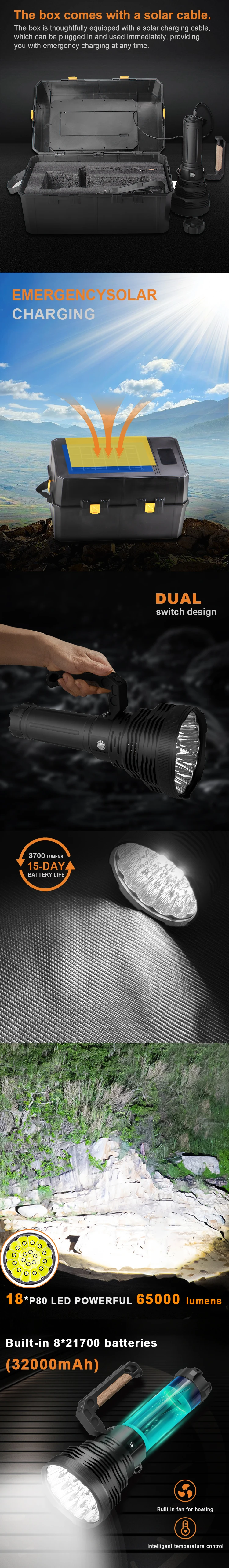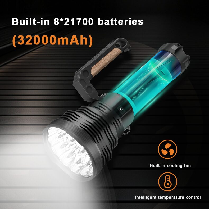 Powered by an integrated 8 × 21700 high-capacity battery system, this unit delivers intense illumination backed by dependable performance. The high-efficiency LED system 100 lm/W ensures powerful output with optimized energy use.