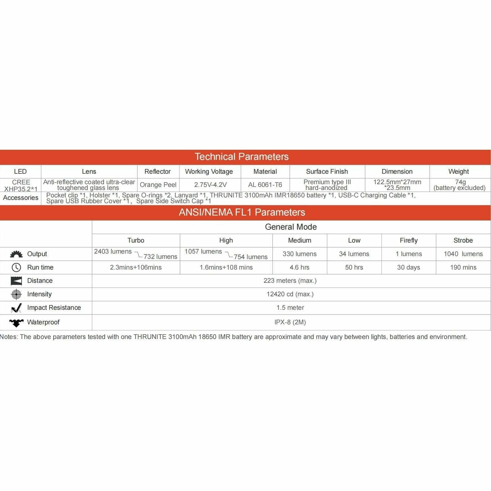 High-Intensity Illumination – The TC15 V3 flashlight boasts a CREE XHP 35.2 LED, providing an impressive 2403 lumens, capable of illuminating up to 731 ft / 223 m. Ensure the light head is firmly screwed for maximum performance.