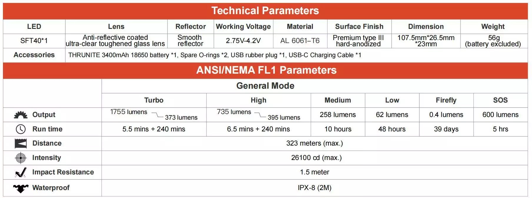 Accessories: THRUNITE Battery *1, Spare O-rings *2, USB Rubber Plug *1, USB-C Charging Cable *1