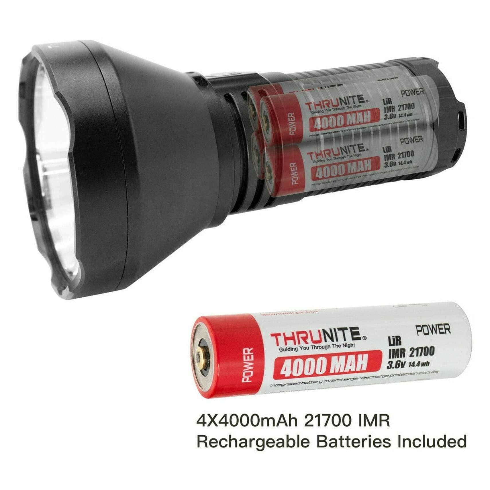 - Essential Accessories Included: The package comprises a ThruNite IMR battery (x4), a USB-C power adapter, a shoulder strap, strap ring, spare O-rings (x2), side switch cap, and rubber covers (x2).