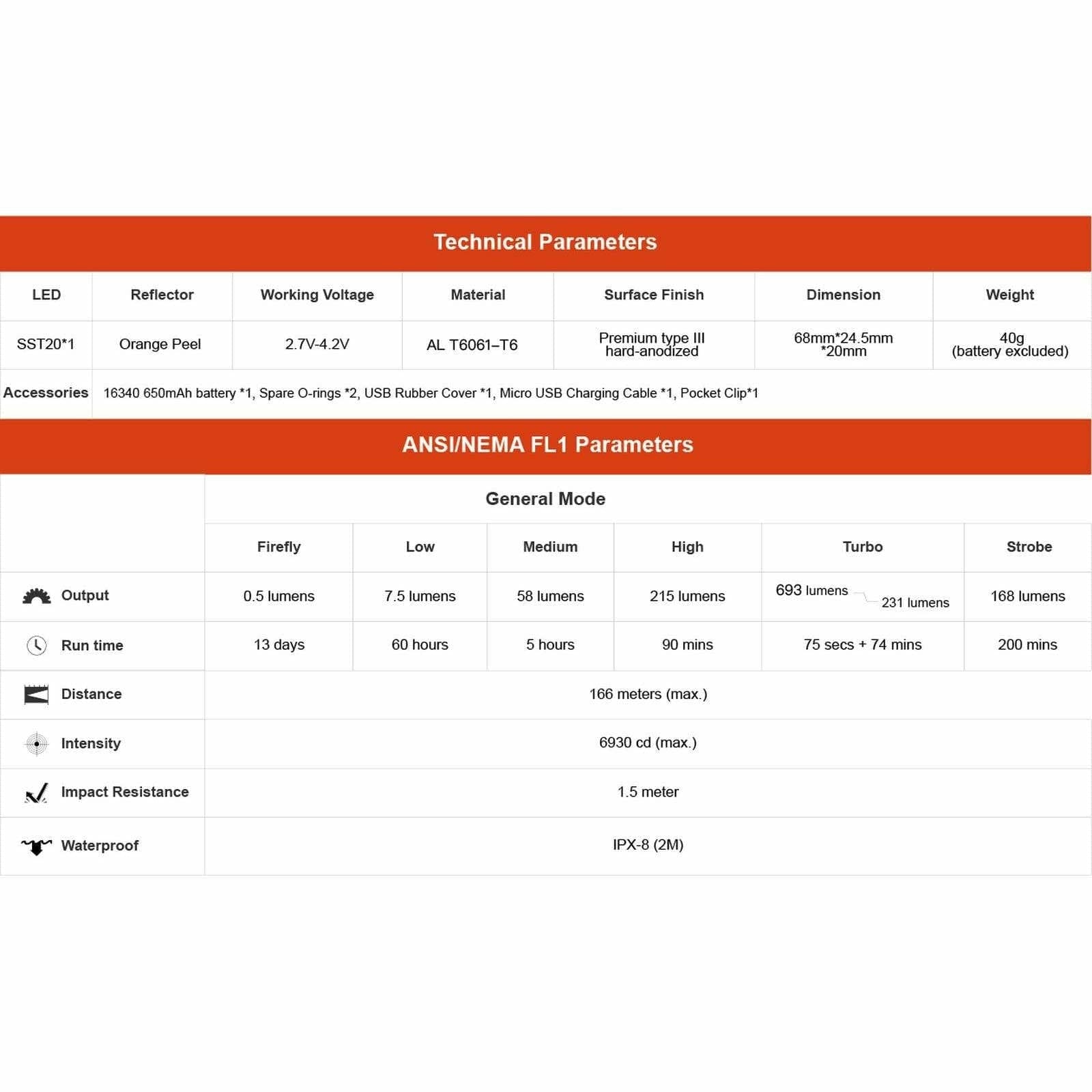 - High-Intensity Illumination: Featuring the SST20 LED bulb, this flashlight offers a brilliant beam that extends up to 544 ft/166 m with a maximum brightness of 693 lumens.