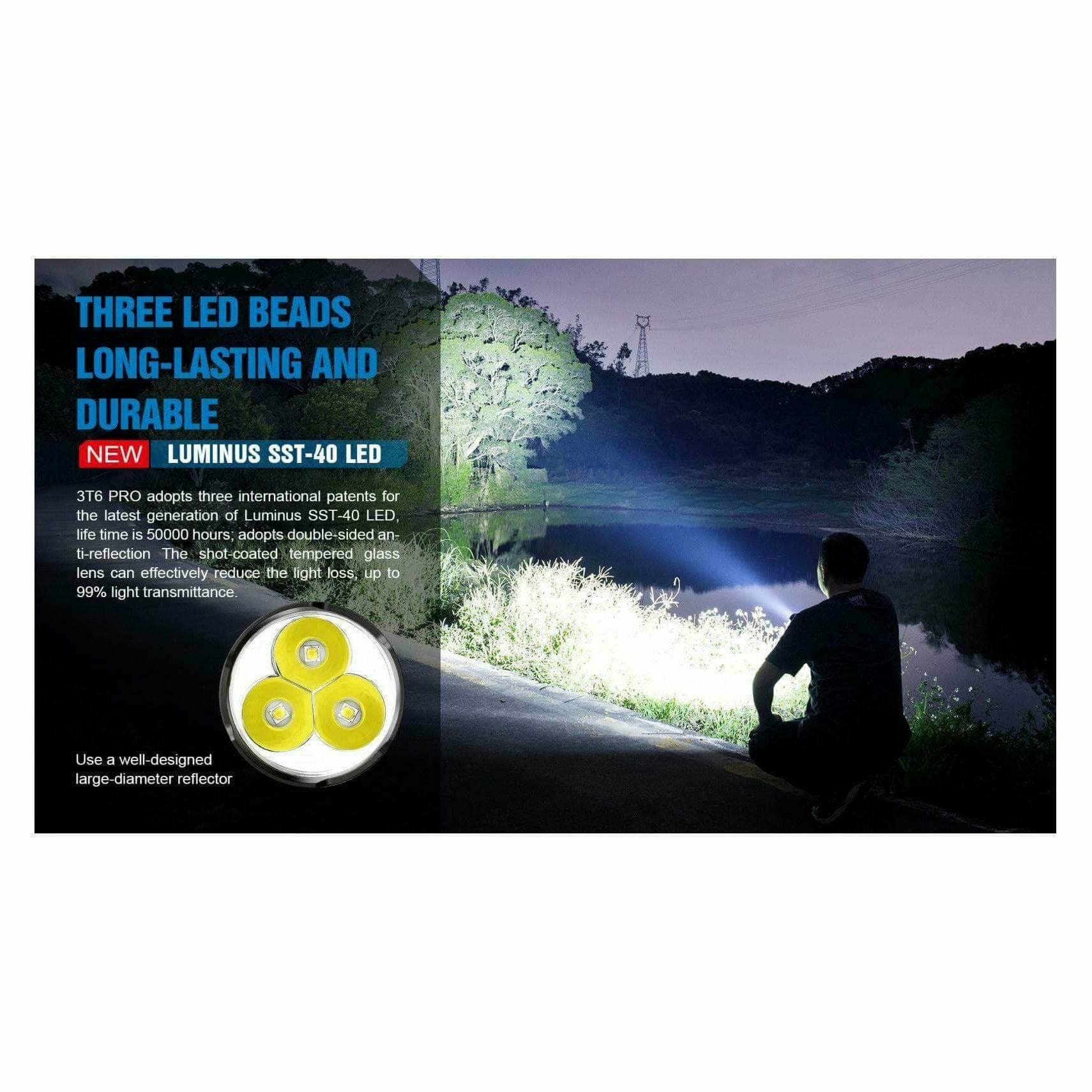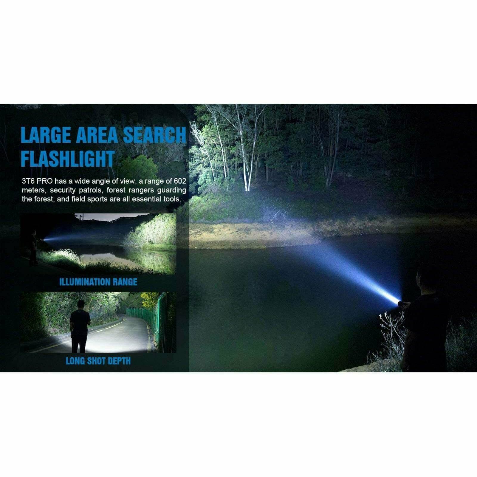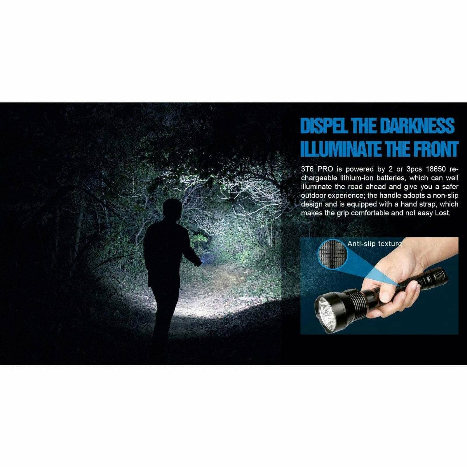 3T6 Pro has extremely high reliability and more operability,four brightness level and strobe, powered by 2 or 3 pieces of 18650 rechargeable lithium ion batteries. Adopting well-designed large-caliber reflector. One-button quick change modes switch on the neck. IP68 waterproof and anti-drop height up to 1 meter, let you safely use it in outdoor environment.